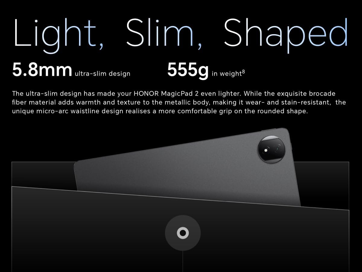 The ultra-slim design has made your HONOR MagicPad2 even lighter. The exquisite brocade fiber material infuses warmth and texture into the metallic body, while also enhancing its wear and stain resistance. The unique micro-arc waistline design creates a more comfortable grip with its rounded shape.