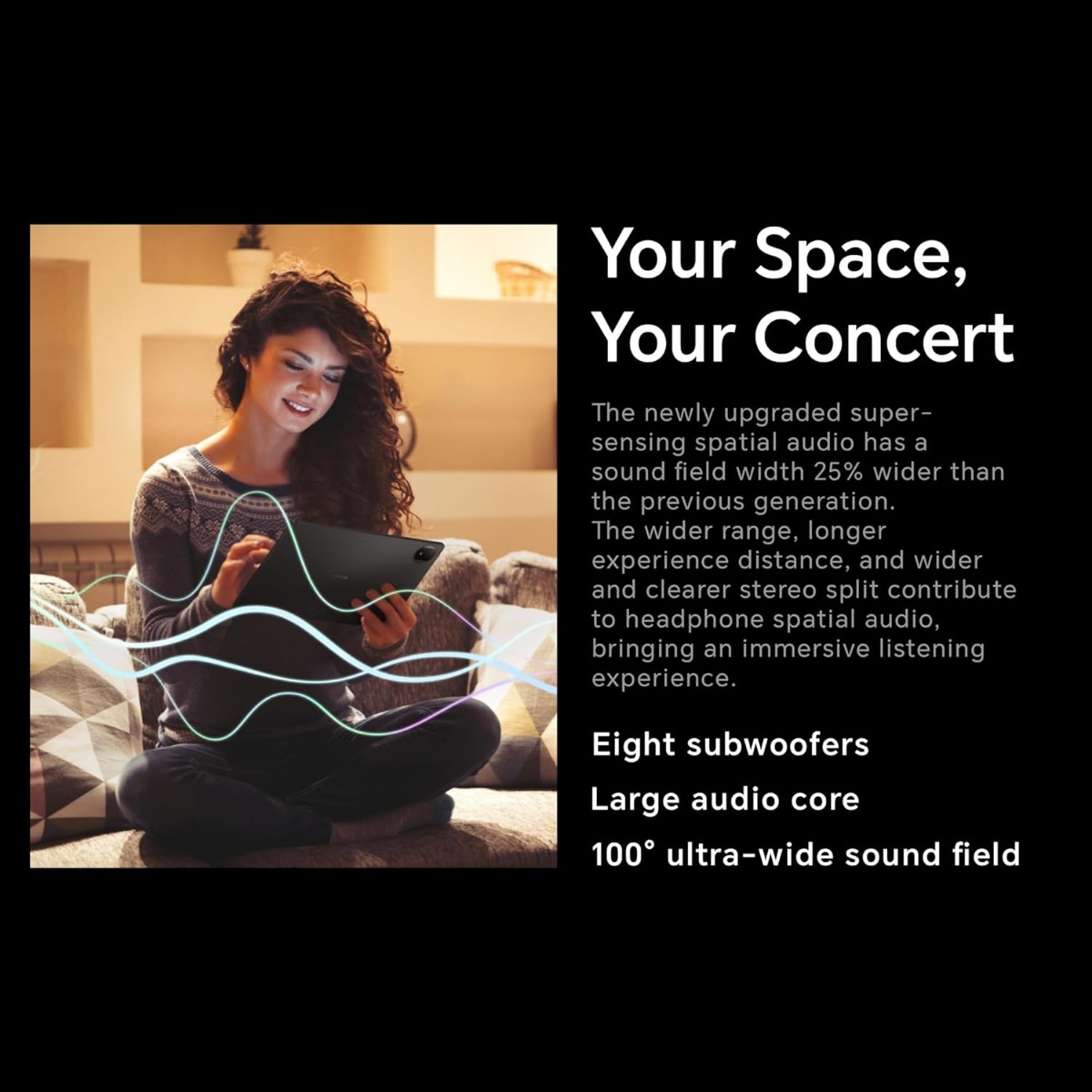 The newly upgraded super-sensing spatial audio has a sound field width 25% wider than the previous generation.9 The expanded range, greater listening distance, and enhanced stereo separation come together to create a captivating headphone spatial audio experience, delivering truly immersive sound.
