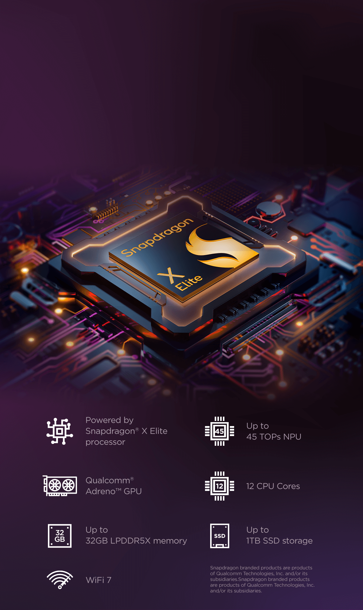 Edit 4K videos without missing a frame. Compile codes in a snap. Smash every task like a pro. Built to unlock AI potential, the best-in-class Qualcomm Snapdragon® X Elite 12-core CPU is your power to hustle.