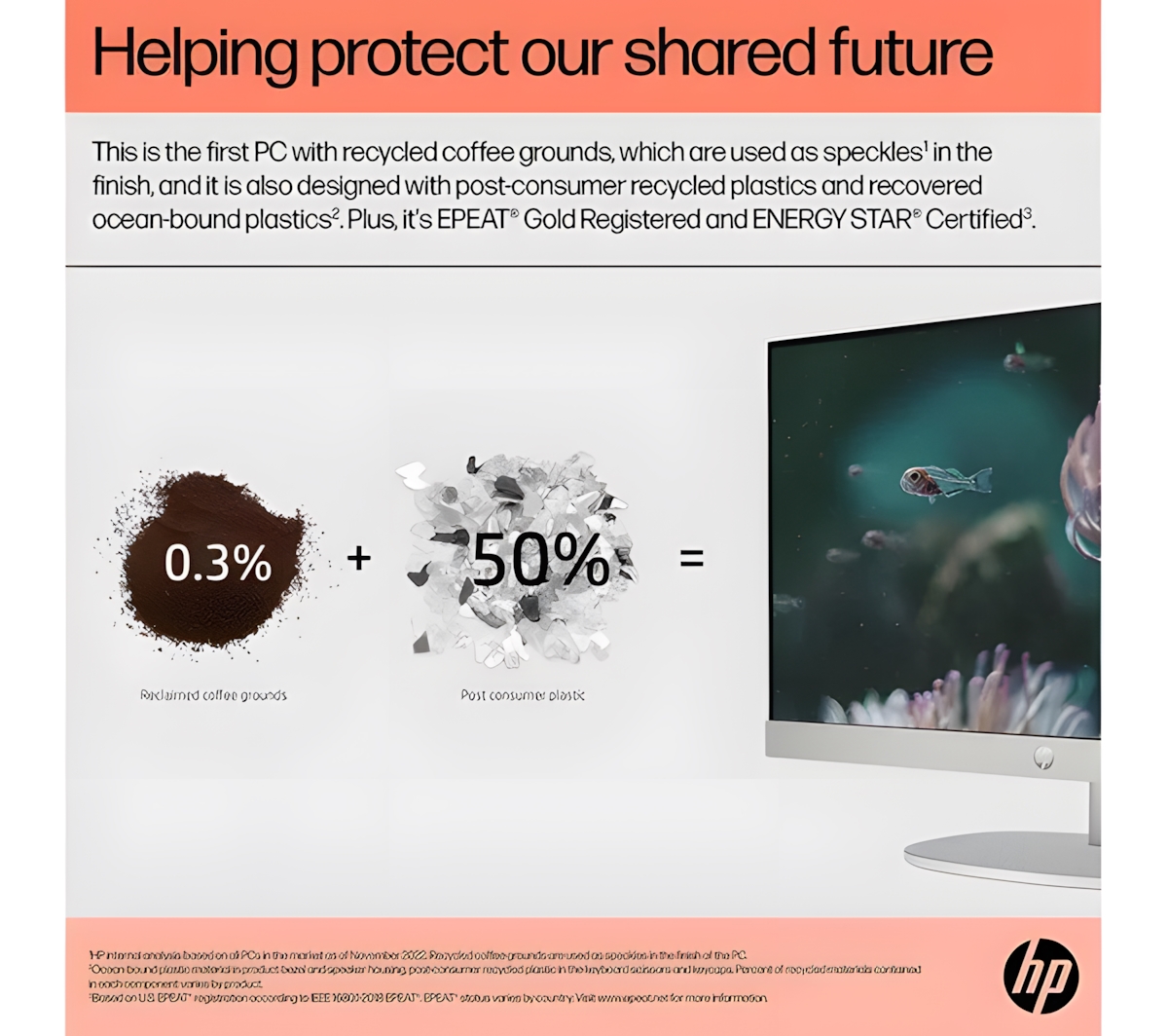 World's first PC with recycled coffee grounds, and contains post-consumer recycled and ocean-bound plastics.