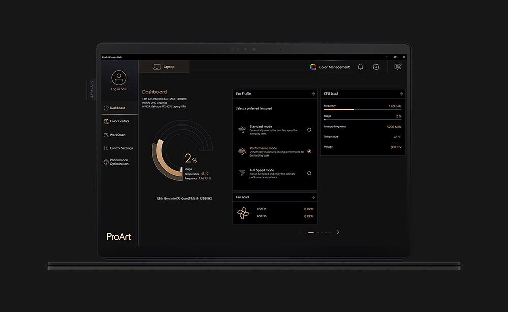ProArt Creator Hub serves as your personal portal for monitoring your device’s status, customizing settings, and enhancing your workflow for limitless creativity. It has an overview Dashboard that enables you to fine-tune Fan Profiles for optimal cooling performance, provides easy access to color calibration tools through Color Control, and enhances your workflow efficiency and performance management with WorkSmart and Performance Optimization. Furthermore, the new Color Management feature delivers precise color data, empowering you to create and store your unique color palettes while staying up-to-date with the latest color trends for endless inspiration. In collaboration with Pantone®, we’ve incorporated digital color data to unleash your untamed creativity.