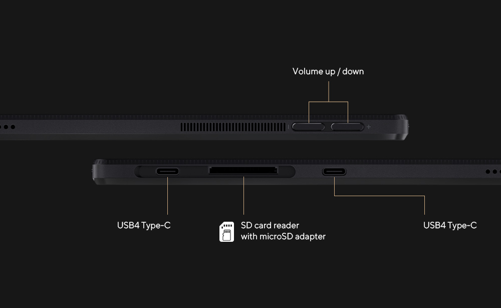 ProArt PZ13 boasts rich connectivity options. The two high-speed USB4 Type-C ports support fast charging, up to 5K external displays, and up to 40 Gbps data transfers. The SD Card reader is compatible with microSD cards for direct video and photo transfers from your gadgets.