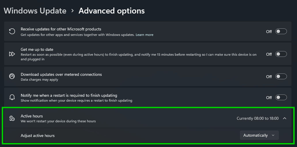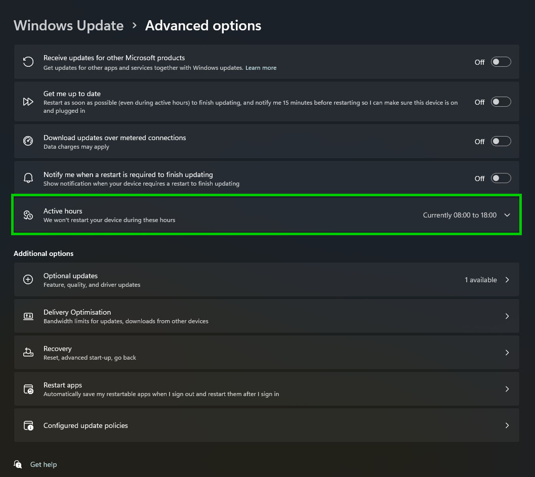 Next to where it says Active Hours, you can select active hours. This will automatically figure out a good time when the computer is on, but not in use to run the updates. Alternatively, next to active hours you can select manually. This will allow you to choose your own active hours and configure the computer to run the updates at times of your choosing.
