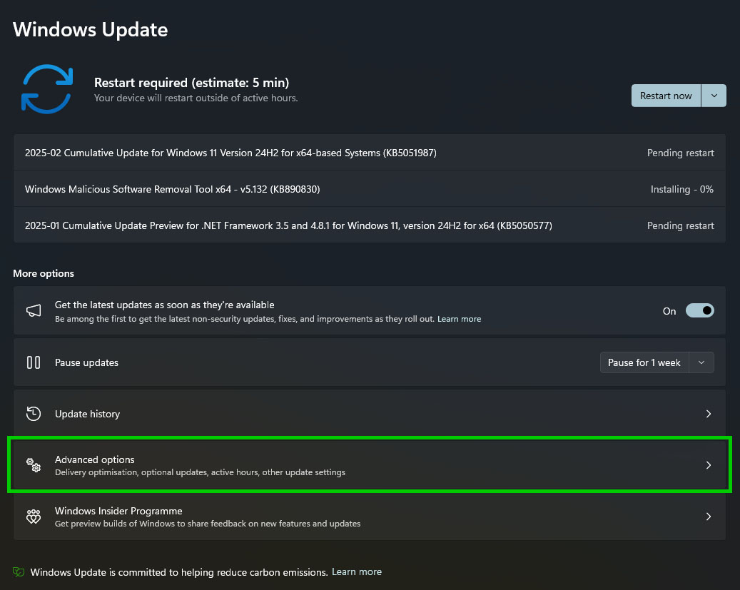 In the same procedure as step 1, above: Select Start > Settings > Windows Update. Once there, click on Advanced Options.