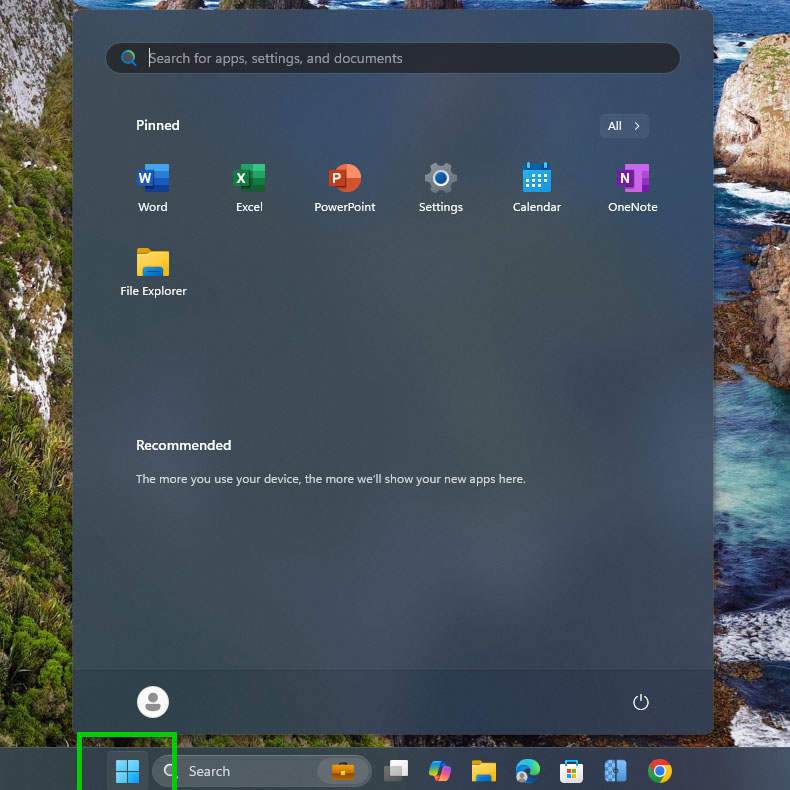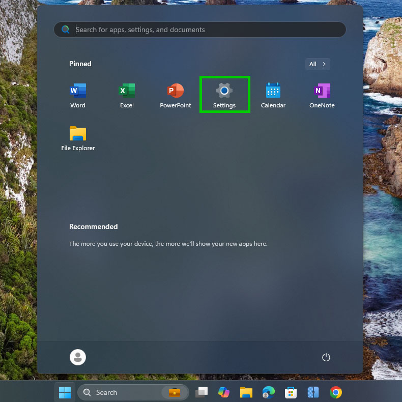 Using the mouse, trackpad, keyboard or touchscreen, select the 'Windows Icon or the Start Menu Icon in the icon tray at the bottom of your screen. This will bring up the start menu. Once the start menu has opened, click on settings, then Windows Update.