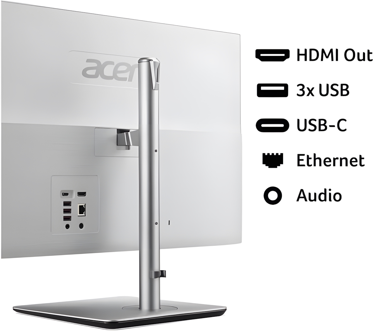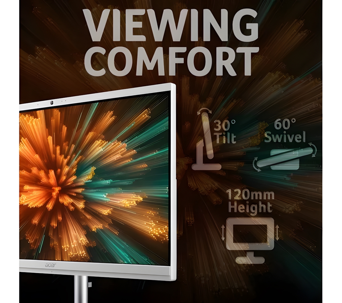 Slim, ergonomic, and minimalist, Aspire C all-in-one delivers exceptional flexibility and maneuverability—with a tiltable screen (-5 to 25°) and swivel (up to 30° L/R) on a versatile height adjustable ergostand at up to 120mm.