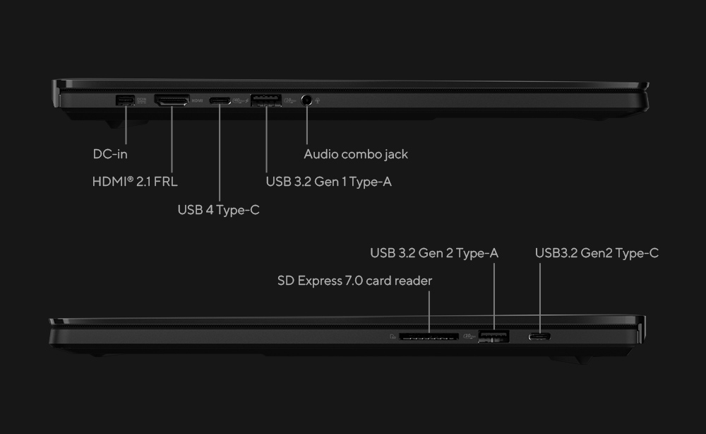Comprehensive I/O ports allow seamless connectivity, for full productivity wherever you are. There’s one 40 Gbps USB 4 Type-C port for fast charging and external displays, alongside a USB 3.2 Gen 2 Type-A port and the latest HDMI® 2.1 FRL port, as well as an SD Express 7.0 card reader for quick transfers. Ultrafast Wi-Fi 7 ensures seamless connectivity anywhere.