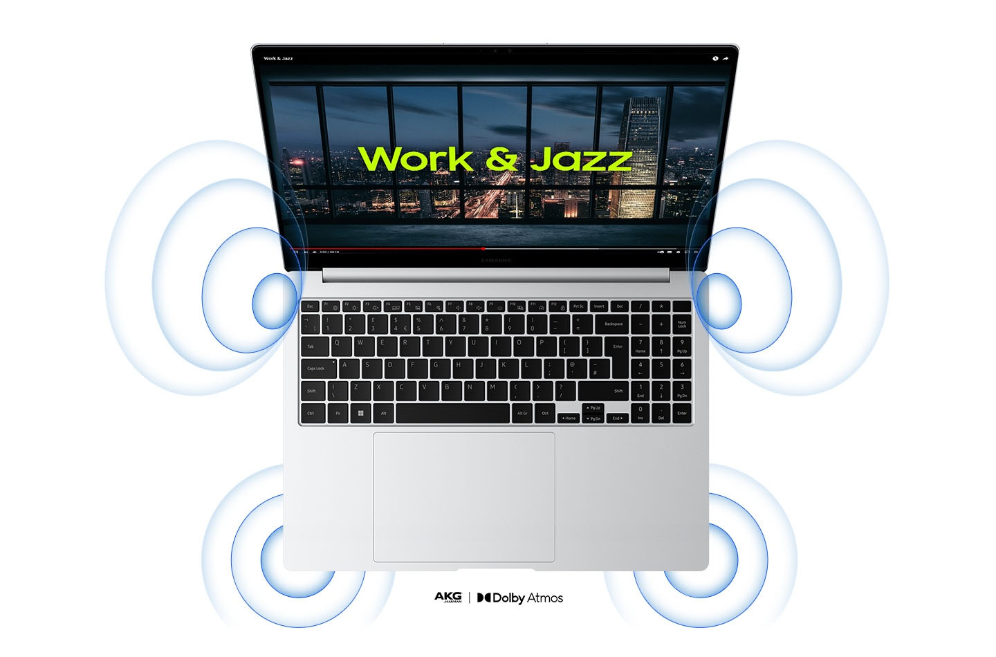 Boost your viewing experience with the rich and deep audio of the quad-speaker system on Galaxy Book4 Pro. The four speakers are tuned with AKG and Dolby Atmos surround sound, so you feel fully immersed.