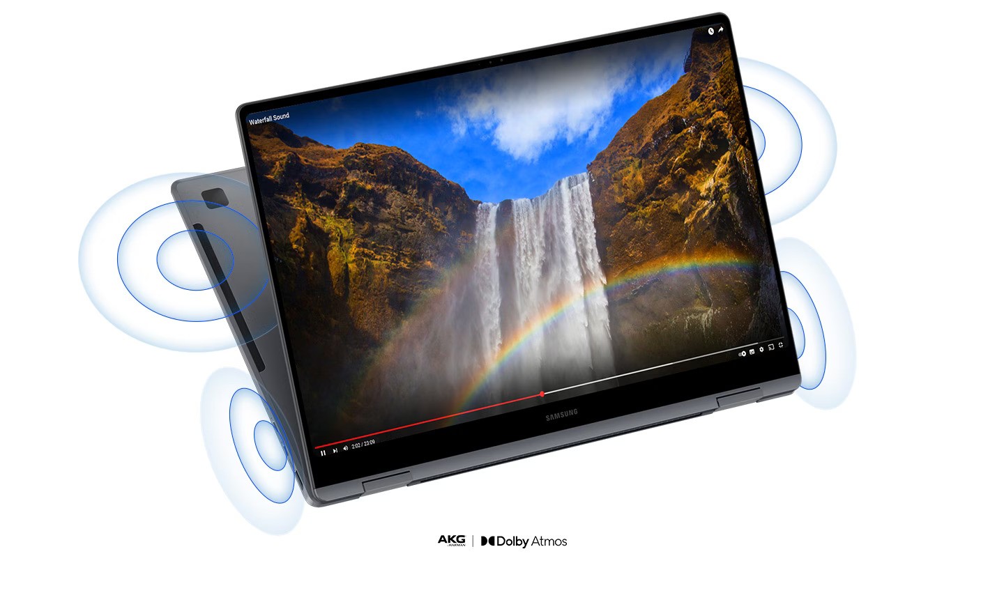 Dive into your content with the rich, deep sound of the quad-speaker system on Galaxy Book4 Pro 360. The four speakers are tuned with AKG and Dolby Atmos, enveloping you in surround sound that keeps you immersed in the moment.