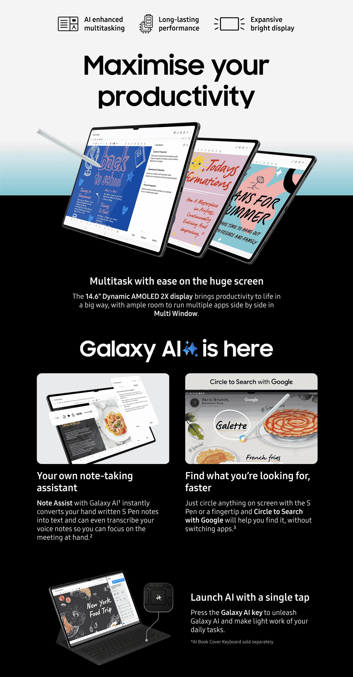For the first time ever Tab S10 Series is pre-equipped with Galaxy AI — putting a massive, AI-powered studio canvas in your hands.