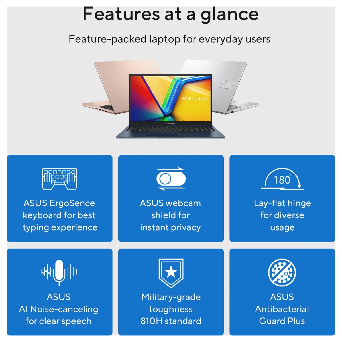 Turn everyday tasks into something special with Vivobook 15, your essential tool for getting things done easier, anywhere. It’s completely user-friendly too, with its 180° lay-flat hinge and physical webcam shield. ASUS Antimicrobial Guard Plus protects frequently-touched surfaces from harmful bacteria, safeguarding your health. Make all your days more enjoyable with Vivobook 15!