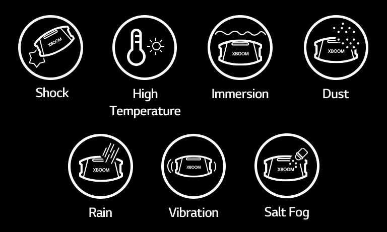 The LG XBOOM Go XG8T has passed US military-grade testing. Take your speaker anywhere without worry and throw a party anywhere.